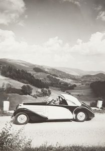 joint : 2 épreuves de lecture, tirage en noir et blanc (34 x 23 cm), un tirage plus petit (18 x 13 cm) ainsi que le négatif de la photographie du catalogue présentant le cabriolet décapotable 57 « Stelvio ». État moyen.