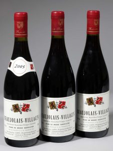 3 Bouteilles Beaujolais Villages - "Clos le Petit Saint Cyr" - J. M. SAPIN 2005. Deux collerettes millésime manquantes.