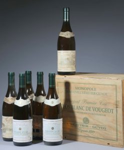 6 Bouteilles Vougeot 1er cru "Clos Blanc de Vougeot" Domaine L'Héritier-Guyot 1995. Caisse bois d'origine, étiquettes tachées. Provenance : Cave de Marina Vlady.