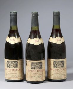 Lot de 5 Bouteilles de vins rouges divers de Bourgogne : - 1 Bouteille Aloxe Corton - Cauvard Père & Fils 1973. - 3 Bouteilles Beaune 1er cru "Teurons" - Cauvard Père & Fils 1982. Etiquettes tachées. - 1 Bouteille Beaune 1er cru - Domaine Voiret...