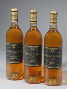 3 Bouteilles Château Guiraud 1er Grand cru classé Sauternes 1988. Etiquettes légèrement tachées. Provenance : Cave de Marina Vlady.