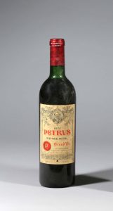 1 Bouteille Petrus 1972 - Pomerol. Etiquette légèrement tachée et légèrement griffée, niveau haute épaule. Provenance : Cave de Marina Vlady.
