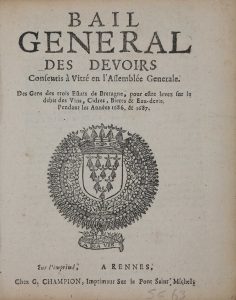[Cidre] [Vins] [Bretagne]. Bail général des devoirs consentis à Vitré en l'assemblée général des gens des trois estats de Bretagne pour estre levez sur le débit des vins, cidres, bières et eaux-de-vie pendant les années 1686 et 1687. À...