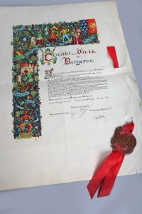 [Confréries] [Vin]. Consulat de la vinée de Bergerac. Diplôme décerné à Jean Nohain. 1974. Imprimé sur papier fort, 570 × 440 mm. Avec sceau (abîmé, défauts). Jean Nohain (1900-1981), parolier, animateur d'émissions de radio et de...