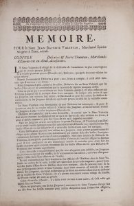 - Mémoire pour le sieur Jean-Baptiste Valentin, marchand épicier en gros à Paris, accusé, contre Descaves et Pierre Trumeau, marchands d'eau-de-vie en détail, accusateurs. [Paris], de l'Imprimerie de Montalant, [vers 1730]. In-folio, [4] p.