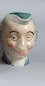 PICHET " TÊTE DE JUGE ANGLAIS ". Faïence polychrome de Sarreguemines. Marqué. H. : 19 cm. Infimes égrenures.