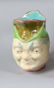 PICHET " TÊTE D'HOMME SOURIANT A LA FRAISE ". Faïence polychrome anglaise. Marqué WARDLE, England. H. : 19 cm.