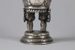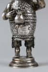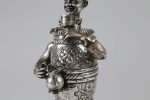L'HOMME-TONNEAU. Rare pot couvert en argent (950 millièmes) en forme de personnage couronné et souriant à la tête mobile, tenant un verre dans sa main gauche et un pichet dans sa main droite. Le corps en forme de tonneau est orné des masques de...