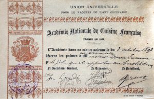 [Pierre Lacam] [Académie de Cuisine]. Beau souvenir de l'Union Universelle pour le Progrès de l'Art Culinaire, crée en 1878 par Joseph Favre. La section française, l'Académie Nationale de Cuisine Française, future Académie de Cuisine, décerne...