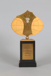 ** [4ème forum American Express]. TROPHÉE INTERNATIONAL DE LA RESTAURATION remis à Raymond Oliver le 20 septembre 1984. Bronze à décor d'un planisphère sur lequel est apposé la France centrée d'une toque de chef. Socle en marbre noir avec...