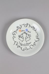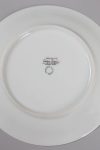 ** OLIVER (Raymond). ASSIETTE RONDE À DESSERT " PALAIS ROYAL ". Dessin de Raymond Oliver d'une double frise de visages masculins dans le goût de Jean Cocteau. Porcelaine dure Georges Boyer, Limoges France, marquée au dos. Signée et titrée. Diam....