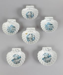 ** OLIVER (Raymond). SUITE DE 6 ASSIETTES À COQUILLES SAINT-JACQUES " AUX ÉPICES ", " PROVENÇALES ", " AUX TRUFFES ". 3 dessins humoristiques de Raymond Oliver illustrant chaque paire de la coquille Saint-Jacques aux épices, la coquille...