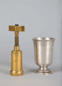 ** TIRE-BOUCHON ET TIMBALE. - Tire-bouchon en laiton doré, au chiffre de Raymond Oliver " R.O. ". H. : 16 cm. - Timbale en étain, au chiffre de Raymond Oliver " R.O. ", sur piédouche cannelé. H. : 11 cm. Provenance : Collection Raymond Oliver,...