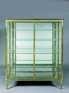 ** [Grand Véfour]. ÉLÉGANTE VITRINE DE STYLE LOUIS XVI. Bronze doré à décor d'un filet de piastres et chute de feuilles d'eau, les montants en façade à pans coupés à décor de chute de feuilles d'eau, les pieds fuselés et...