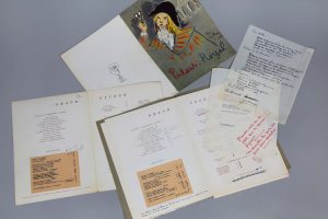 - [Jean Cocteau]. Couverture du menu (sans le menu) à l'Arlequin de Jean Cocteau, lithographie. Au 2ème feuillet, autoportrait lithographié de Raymond Oliver sous-titré : " J'aime beaucoup le Cordon Rouge de Mumm's ".
