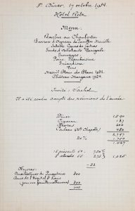 entre autres un turbot à la Chambertin ou du caviar Becle au dîner de l'Automobile club le 15 mai 1935. Au dîner du 14 novembre 1935, toujours à l'Automobile club, on but du Pommery 1926. Ces notes manuscrites ont été probablement détaillées par le secrétaire ou trésorirer de l'association qui indique pour chaque dîner le nom des personnes présentes, les invités, les comptes et les œuvres (Amis de L'Hôpital Saint Louis, le service social du 15-20…).