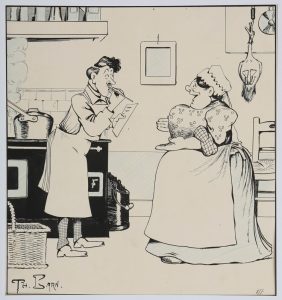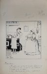 BARN (Théophile). Facétie culinaire. Dessin à l'encre noire sur bristol, vers 1910, rehauts de crayon bleu. Signé en bas à gauche. (Quelques salissures en marge et notes de mise en page). Légendé à l'encre sous le dessin : " Il me faudrait...