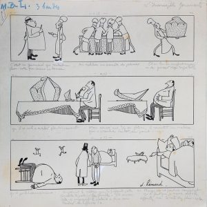 HEMARD (Joseph). L'incorrigible gourmand. Dessin à l'encre sur papier. Vers 1920. Signé en bas à droite. 265 × 263 mm. (Petits trous de punaises aux angles, 2 coins pliés en marge). Dessin composé de 8 scènes réparties en 3 bandes,...