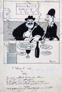 MORISS. Ensemble de 2 dessins, encre sur papier, dont un avec rehauts de lavis bleu. Vers 1910. Signés en bas à droite, légendés à l'encre : - " Au restaurant, ou les clients ont toujours tort ". 245 × 292. (Quelques rousseurs en marge) - " Le...