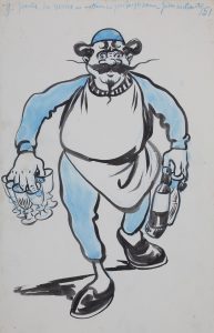 ANONYME. " Prendre les verres en mettant ses gros doigts dedans ". Dessin au lavis d'encre sur papier, vers 1920, rehauts de lavis et crayon bleu. 310 × 200 mm. (trous de punaises dans les angles).