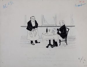 GIRARD (L.). " Au restaurant. - Garçon il y a des cheveux dans le bouillon. - Faut pas vous plaindre, pour ce prix-là on ne peut pas vous donner une perruque ". Dessin à l'encre sur papier fort, vers 1900, rehauts de crayon bleu, signé en bas à...