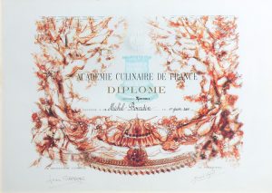 °° [Académie Culinaire de France]. Diplôme de Membre d'Honneur décerné à Michel Bourdin le 1er juin 2005. Beau diplôme sérigraphié d'après P. Niad. 49,4 × 67,2 cm. Cadre moderne sous verre. Il est joint : Médaille de l'Académie...