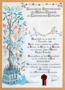 °° [Association Internationale des Maîtres Conseils en Gastronomie Française]. Beau diplôme de cette association conférant le titre de commandeur à Michel Bourdin en date du 7 novembre 1985. 63 × 49 cm. Sous marie-louise et cadre...