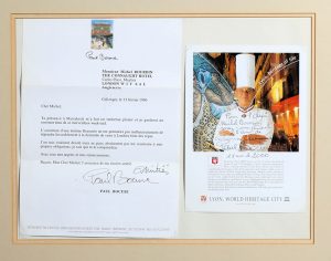 °° [Paul Bocuse]. Composition réalisée par Michel Bourdin comprenant : - envoi autographe signé de Paul Bocuse du 18 avril 2000 " pour ses 25 ans de très bonne cuisine " - tapuscrit autographe signé de Paul Bocuse indiquant à Michel Bourdin...