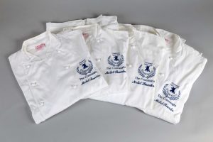 °° [The Connaught]. 4 VESTES DU CHEF MICHEL BOURDIN en coton. Il est brodé sur le cœur en bleu les armes du Connaught avec sa devise " Placere Placet ", le nom du restaurant, le rappel du centenaire 1897-1997 et le nom du chef. Taille 56. Traces...