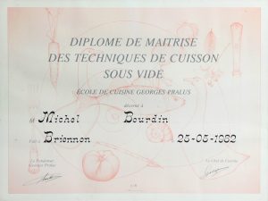 °° Diplôme de Maîtrise des Techniques de Cuisson sous vide. École de cuisine Georges Pralus décerné à Michel Bourdin le 25 mai 82. 38 × 49,5 cm. Cadre moderne. Provenance : Collection Michel Bourdin, Chef du Connaught à Londres.