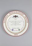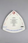 - [National Restaurateurs' Dinner, 1999]. Assiette triangulaire à côtés arrondis en porcelaine blanche de Dudson déclinant le menu Au Savoy le Lundi 10 mai 1999, les chefs l'ayant préparé et les organisateurs The Academy of food & wine service, The Restaurant Association, Academy of Culinary Arts.