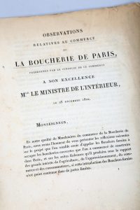 [Boucherie parisienne]. Observations relatives au commerce de la boucherie de Paris, présentées par le syndicat de ce commerce à son excellence Mgr. le ministre de l'intérieur, le 23 décembre 1822. [Paris], impr. de Cordier, 1822. In-4, 75 p.,...