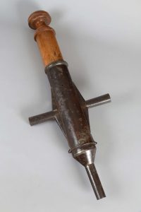 [Boucherie]. RARE EMBOSSOIR OU POUSSOIR A SAUCISSON. Fer à piston en bois monoxyle. Début du XIXe siècle. Long. : 53,5 cm. Quelques manques. Vermoulus, usures et petits trous.