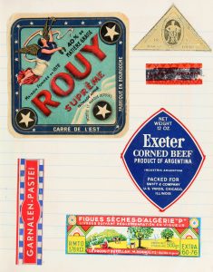 Rhin, fromages (dont cheddar, Vache qui rit), chocolat, viande en boîte, saumon, qui sont souvent des produits anglais ; mais on y trouve aussi une superbe étiquette de cèpes provenant de Corrèze. La fin du volume renferme quelques étiquettes de compagnies maritimes et d'hôtels. Le recueil pourrait avoir été commencé dans un camp de travail ou de prisonniers, comme en atteste la présence, au début du volume, d'exemples de la monnaie-papier d'un camp allemand ; il s'y trouve également 2 cartes à l'effigie du maréchal Pétain.