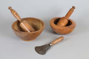 [Aromates]. 2 MORTIERS ET LEUR PILON. Bois. XIXe siècle. H. : 8,5 et 10,5 cm. Diam. : 22 et 24,5 cm. Vermoulus. Il est joint : HACHOIR A FINES HERBES. XIXe siècle. Long. : 24 cm.