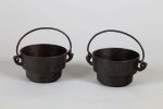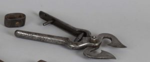 [Sucre]. PINCE OU SÉCATEUR À SUCRE " CANDI ". Fre. XIXe siècle. Long. : 21,5 cm. Il est joint : 2 RARES MARMITES DE dînette. Fonte. XIXe siècle. H. : 6 cm. Diam. : 10 cm.