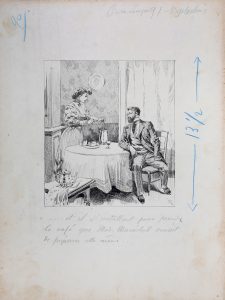 [Café]. STARACE (Gino). "… et il s'installait pour prendre le café que Mad. Maréchal venait de préparer elle-même… ". Dessin à l'encre sur carton, légendé au crayon, signé d'initiales en bas à droite. 312 × 234 mm. (annotations de mise...