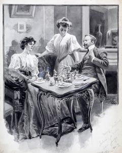 [Thé]. STARACE (Gino). " Tenez, madame Julien "… Dessin à l'encre noire et lavis sur carton, rehauts de bistre. Signé en bas à droite. 302 × 242 mm.