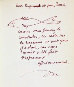 Bel envoi illustré d'une sardine, de l'éditeur bibliophile à Raymond et Mari Oliver : " Comme vous pouvez le constater, ces cadavres de poissons n'ont pas d'odeur, car mon travail a été fait proprement ".