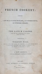 CARÊME (Antonin). HALL (William) (trad.). French cookery, comprising L'Art de la cuisine française ; Le Pâtissier royal ; Le Cuisinier parisien by the late M. Carême. Translated by William Hall. London, Murray, 1840. Fort in-8, [1] f. (titre),...