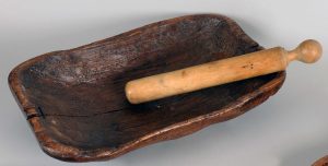 RARE BAC A PÂTON & ROULEAU À PÂTISSERIE. Bois. Le bac est consolidé de 2 attaches en fer. XIXe siècle. 11 × 59,5 × 29,5 cm. Rouleau. Long. : 39,5 cm. Le bac à pâton servait à garder au chaud un morceau de pâte pétrie, ce levain naturel...