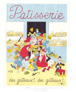DUBOUT. Pâtisserie. Des gâteaux !… des gâteaux !… Affichette. Lithographie en couleurs, Paris, Patifrance, 1956. 40 × 30 cm.