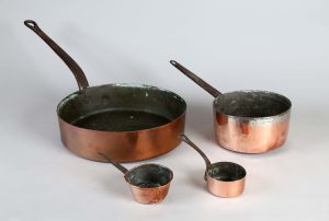 1 SAUTEUSE & 3 CASSEROLES. 1 sauteuse et 3 casseroles dépareillées en cuivre, manches en métal. Sauteuse : H. : 9 cm. Diam. : 35 cm. - Casserole : H. 10,5 cm. Diam. : 21 cm. Petites casseroles : H. : 5 et 4 cm. Diam. : 10 et 9 cm. Usures du temps....