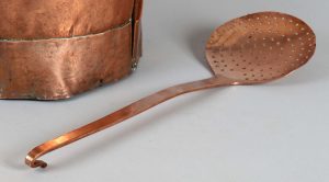 ÉCUMOIRE À BOUILLON. Cuivre. Long. : 51 cm. Usures du temps.