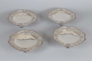 SUITE DE 4 COMPOTIERS. Argent (950 millièmes) de forme octogonale, les angles incurvés, à décor en partie ajouré de rinceaux, coquilles et réserves à motifs d'écailles. La bordure soulignée d'une frise d'oves. Ils reposent sur quatre pieds...