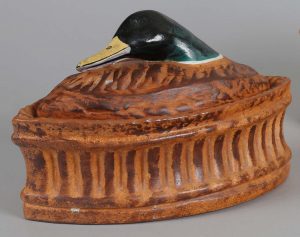 TERRINE AU COL VERT. PILLIVUYT & Cie à Mehun. Terrine ovale en porcelaine vernissée, couvercle au col vert. Signée Pillivuyt, marquée 3 en creux. 23 × 11,5 cm.