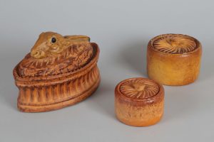 3 TERRINES AU LIÈVRE ET AU SOUFFLÉ. PILLIVUYT & Cie à Mehun. Terrine ovale en porcelaine vernissée, couvercle au lièvre. Marque Pilllivuyt, [modèle n° 5]. 25,5 × 16 cm. Accidentée et recollée. - 2 terrines rondes en porcelaine vernissée,...