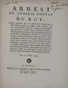 [Gibier]. Arrest du conseil d'estat du roy… concernant la perception des droits sur la volaille et gibier… 1764. In-4, 7 p., en feuille tel que paru.
