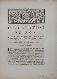l'usage d'un filet nommé ret-traversier & chalut pour faire la pesche du poisson à la mer. Donnée à Marly le 20 décembre 1729. Paris, Impr. royale, 1730. In-4, 4 p., bandeau gravé sur bois.