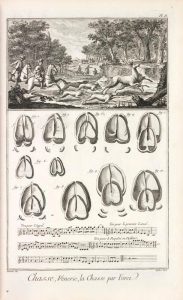 Réunion de deux suites de gravures de l'Encyclopédie, complètes des 23 planches des Chasses et des 35 planches des Pêches, accompagnées du texte explicatif. On a relié en fin de volume une autre planche de l'Encyclopédie pour le Perruquier, baigneur étuviste. # Une étude de chiens et sanglier gravée à l'eau-forte par Jean Le Pautre est jointe, montée sur une garde. # De la bibliothèque cynégétique Robert Lefèvre-Pontalis, avec ex-libris. # Coiffe de tête rognée, fente sur un mors, infime réfection marginale sur une planche, quelques rousseurs sur le texte.
